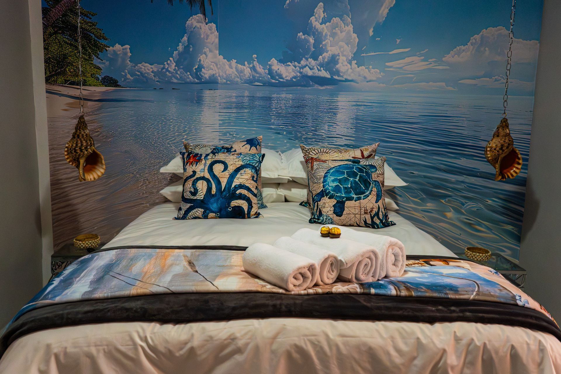 Our spacious "Seaview Unit" has one bedroom featuring coastal inspired décor and an ocean mural as a stunning backdrop. Enjoy a comfortable double bed, built-in cupboard, and a beautiful dressing table with chair, all complemented by plush bedding and uninterrupted ocean views.