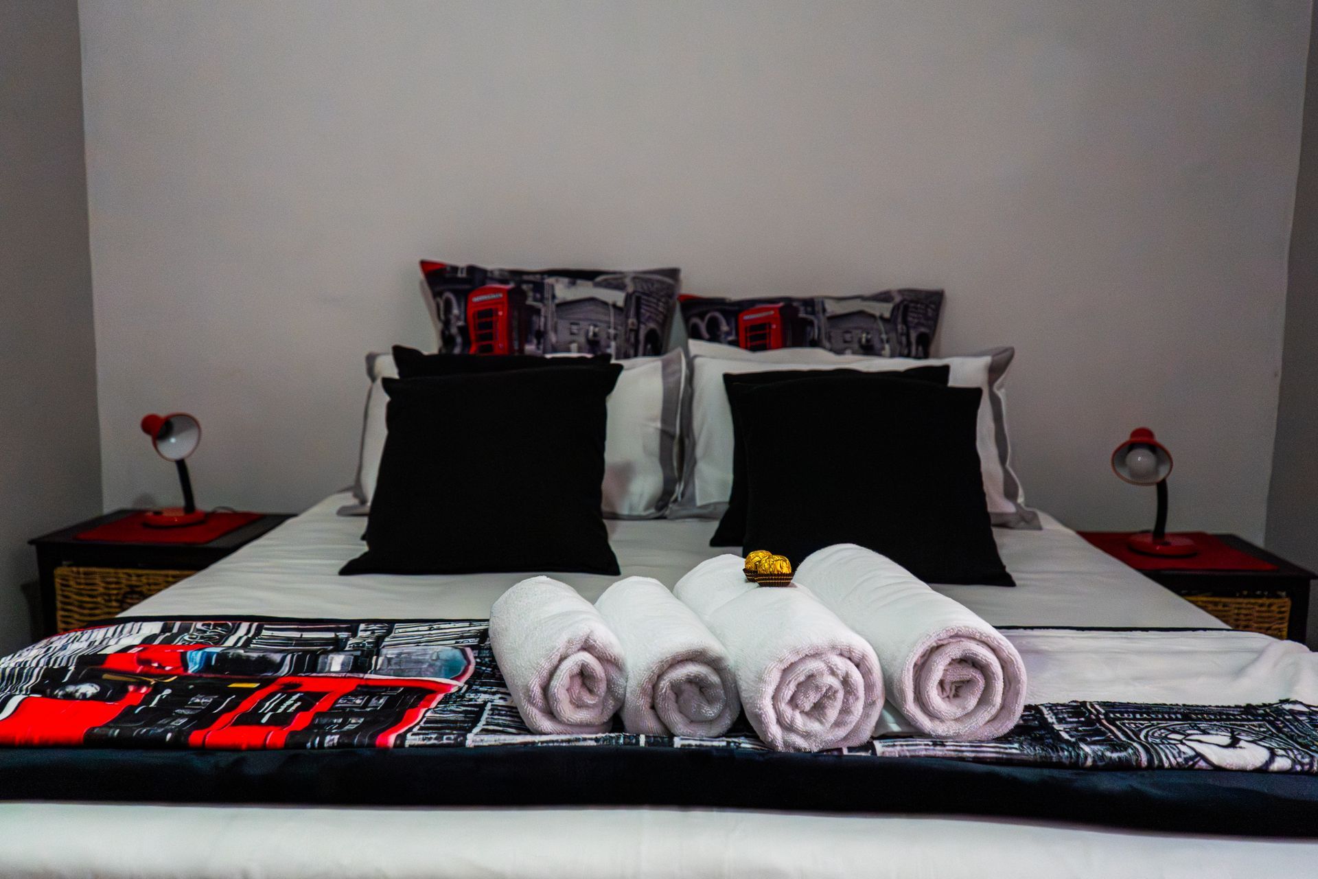 The British Unit bedroom embodies timeless elegance with its striking black and red theme. A luxurious queen-sized bed, dressed in soft white linens with red and black accents, stands as the centerpiece of the room. The décor combines classic British sophistication with modern comfort . The refined dressing table and sleek built-in cupboard that completes the space. Soft lighting and thoughtful details create a warm, romantic atmosphere, while every element, from the cushions to the finishes — reflects the bold yet graceful spirit of El-Tsuri’s British charm.