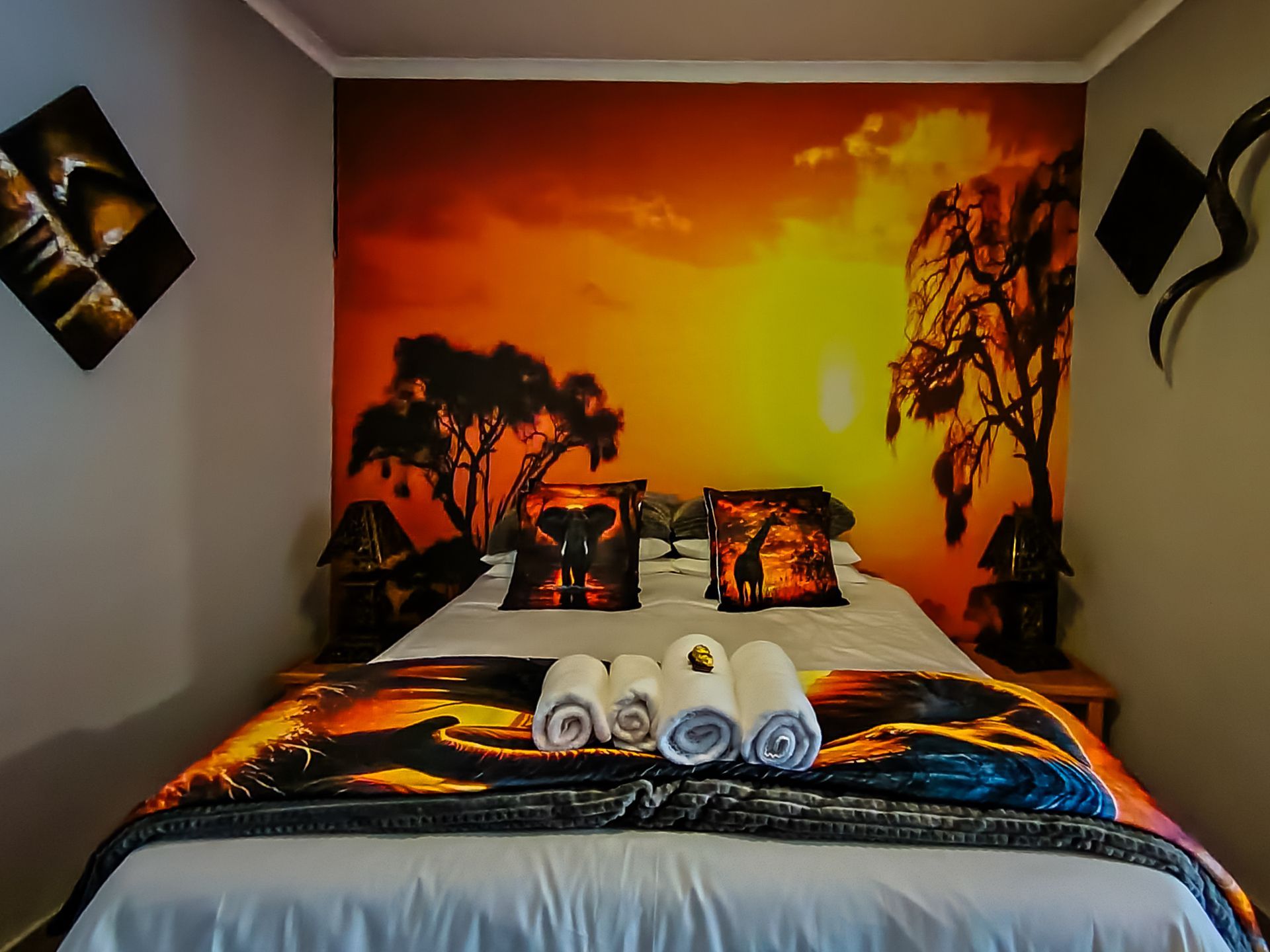 The African Unit bedroom reflects the warm, earthy essence of the South African savannah. Natural tones of golden sand, deep brown, and sunset orange create a soothing, wild-inspired atmosphere. A striking savannah mural sets the scene, while the queen-sized bed with textured throws and woven cushions invites restful comfort. Handcrafted décor, wood, and rattan accents add authentic charm, complemented by a built-in cupboard and elegant dressing table. A retreat where comfort meets the untamed beauty of El-Tsuri’s African spirit.