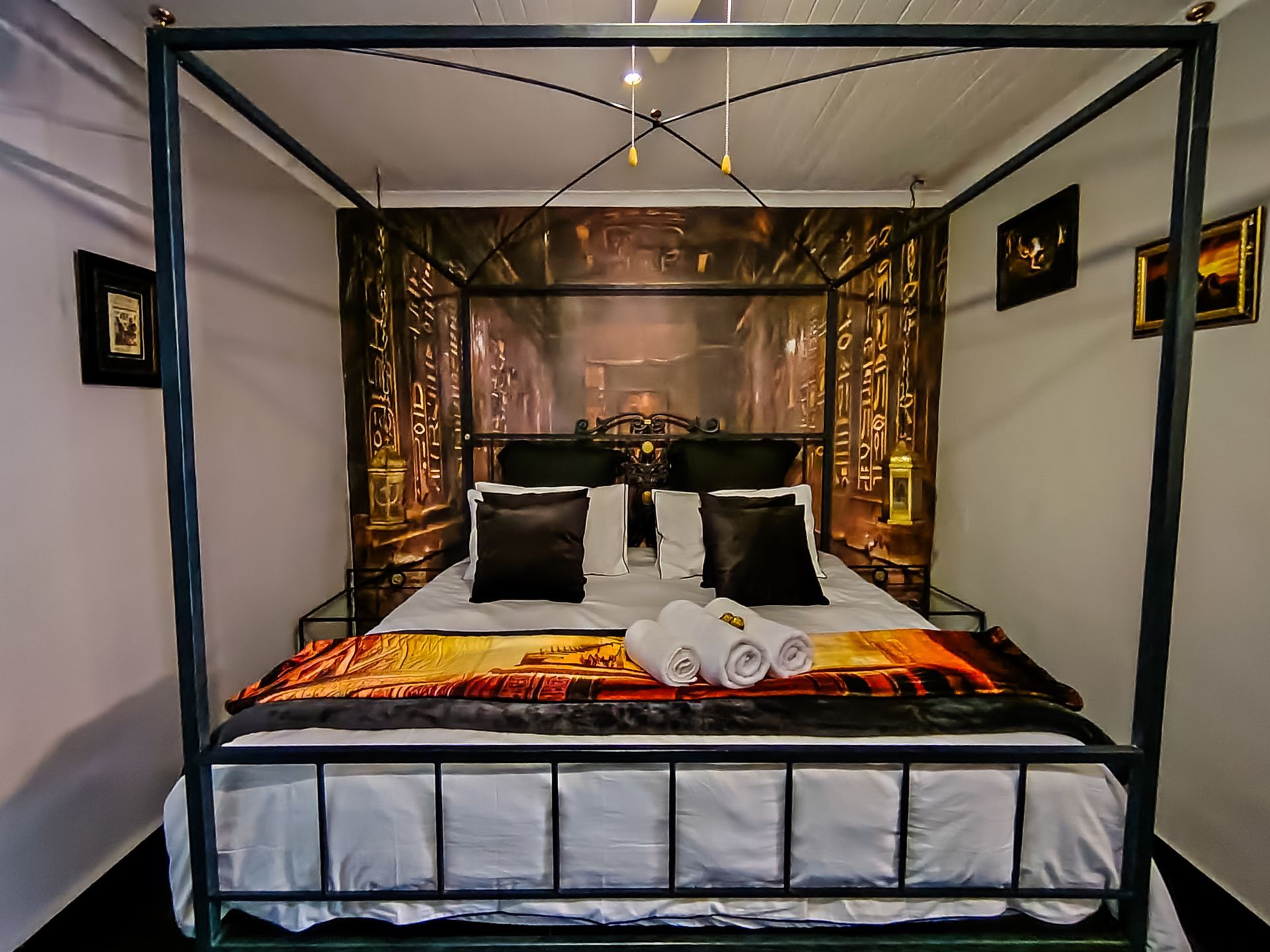 The Egyptian bedroom takes you on a tour of ancient Egyptian history, it has a striking hieroglyphic mural that sets the tone, while the huge King-sized bed with rich linens and golden accents invites restful comfort. Handcrafted décor, papyrus-inspired textures, and ornate details echo ancient artistry.